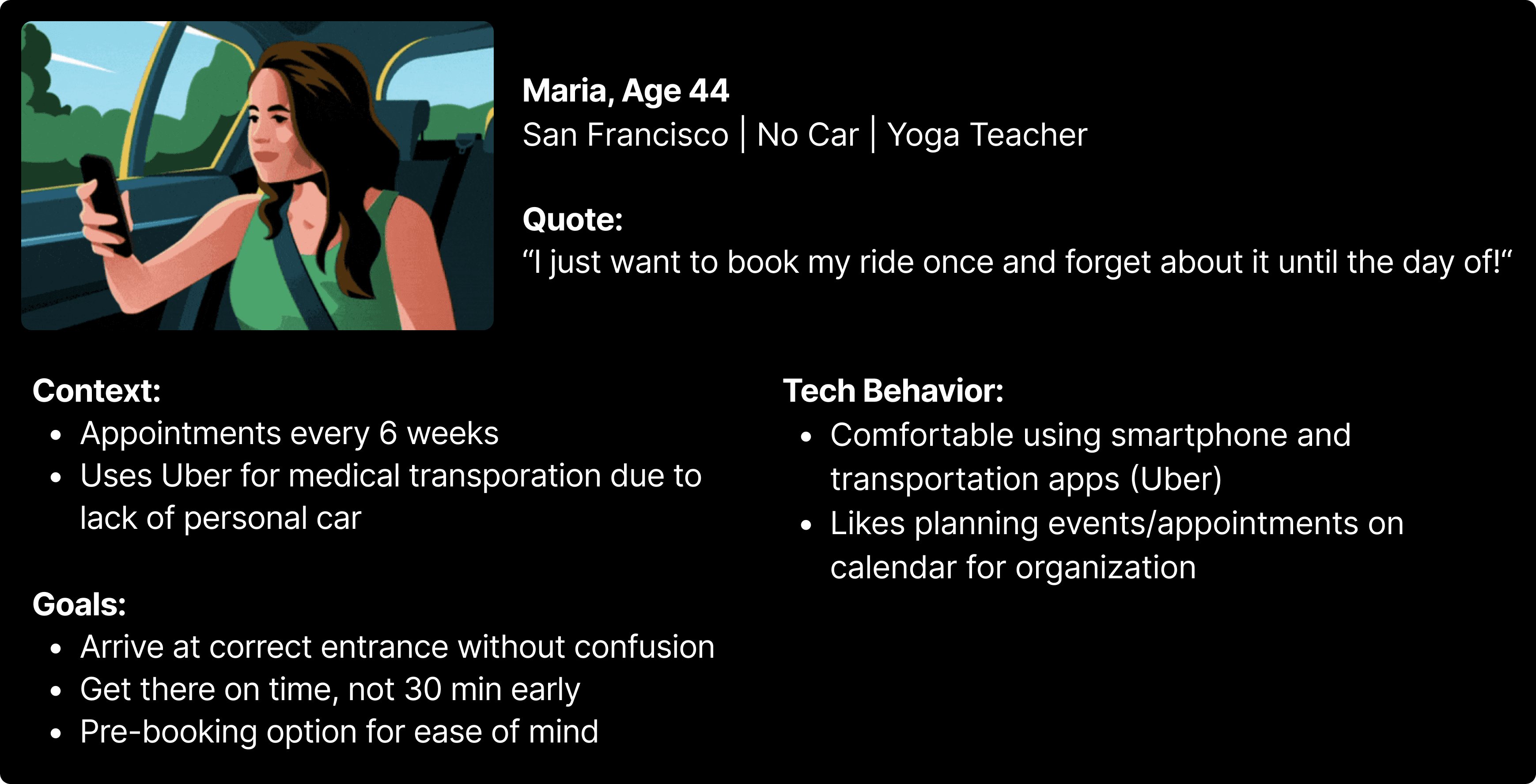 I conducted 4 interviews with users who have used rideshare for medical appointments to identify the process and patient needs.