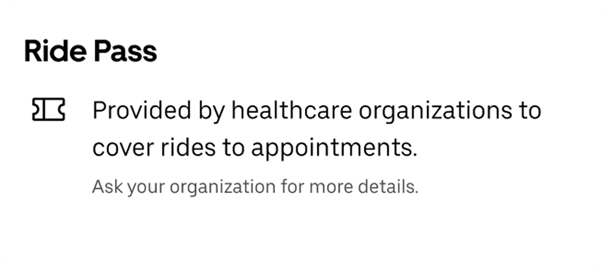 Users can redeem a Ride Pass provided by their healthcare organization via PIN code for covered fees on eligible rides.