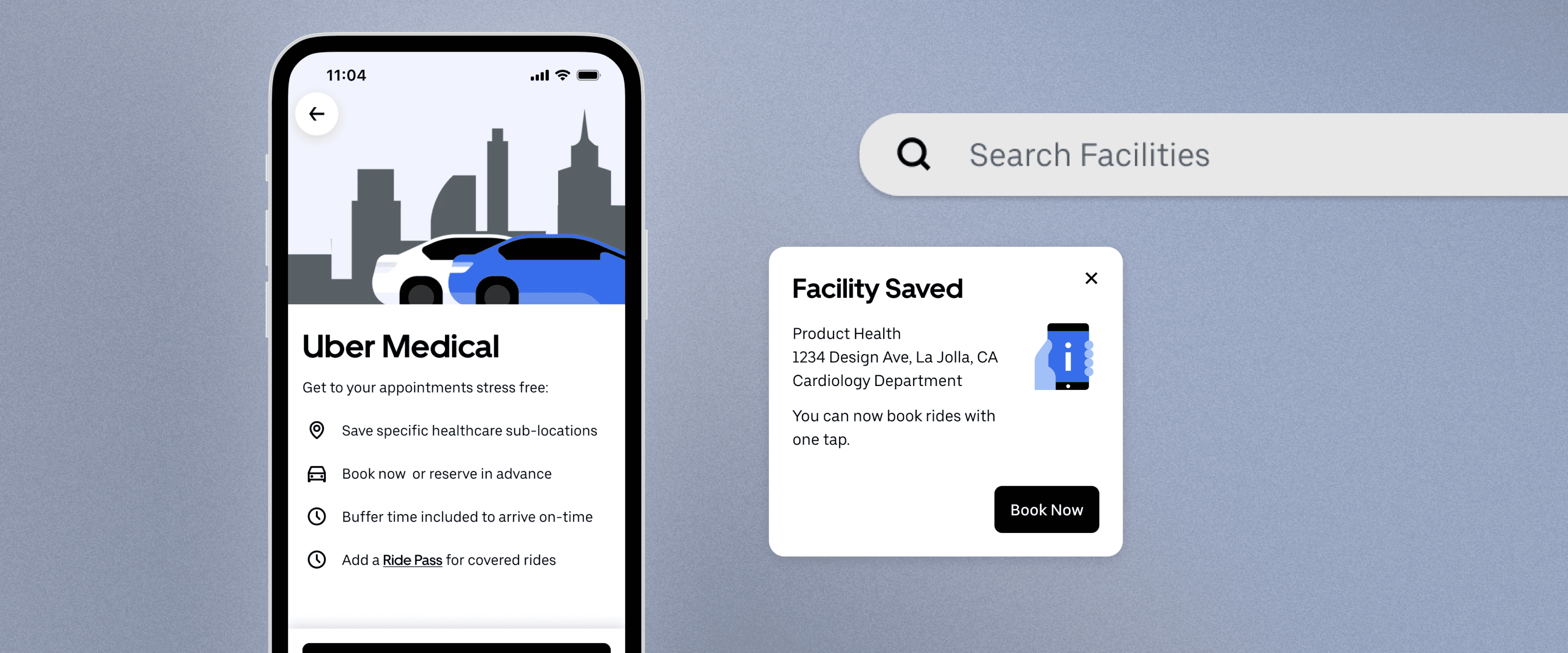 By saving a facility, one-tap booking allows users to easily book on-demand or scheduled rides.